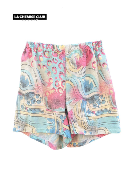 Pink and pastel blue cotton fabric with crazy 80 90 pattern, black sleeves and collar bottom