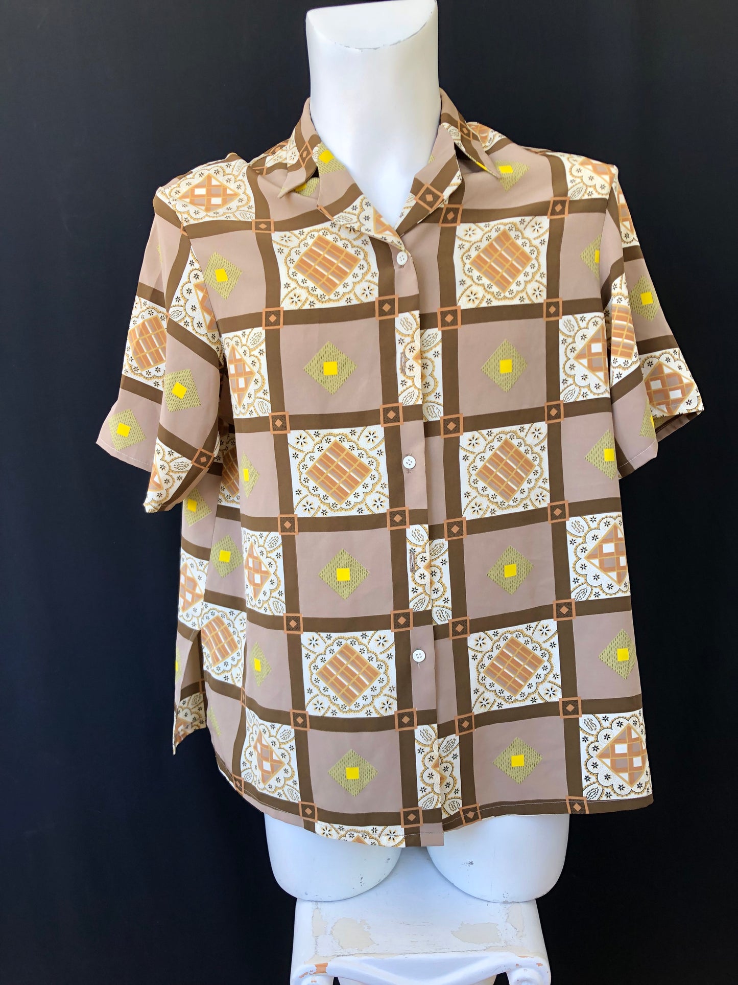 Tissu Polyester chemise a motifs géométrique et fleurs marron beige et jaune