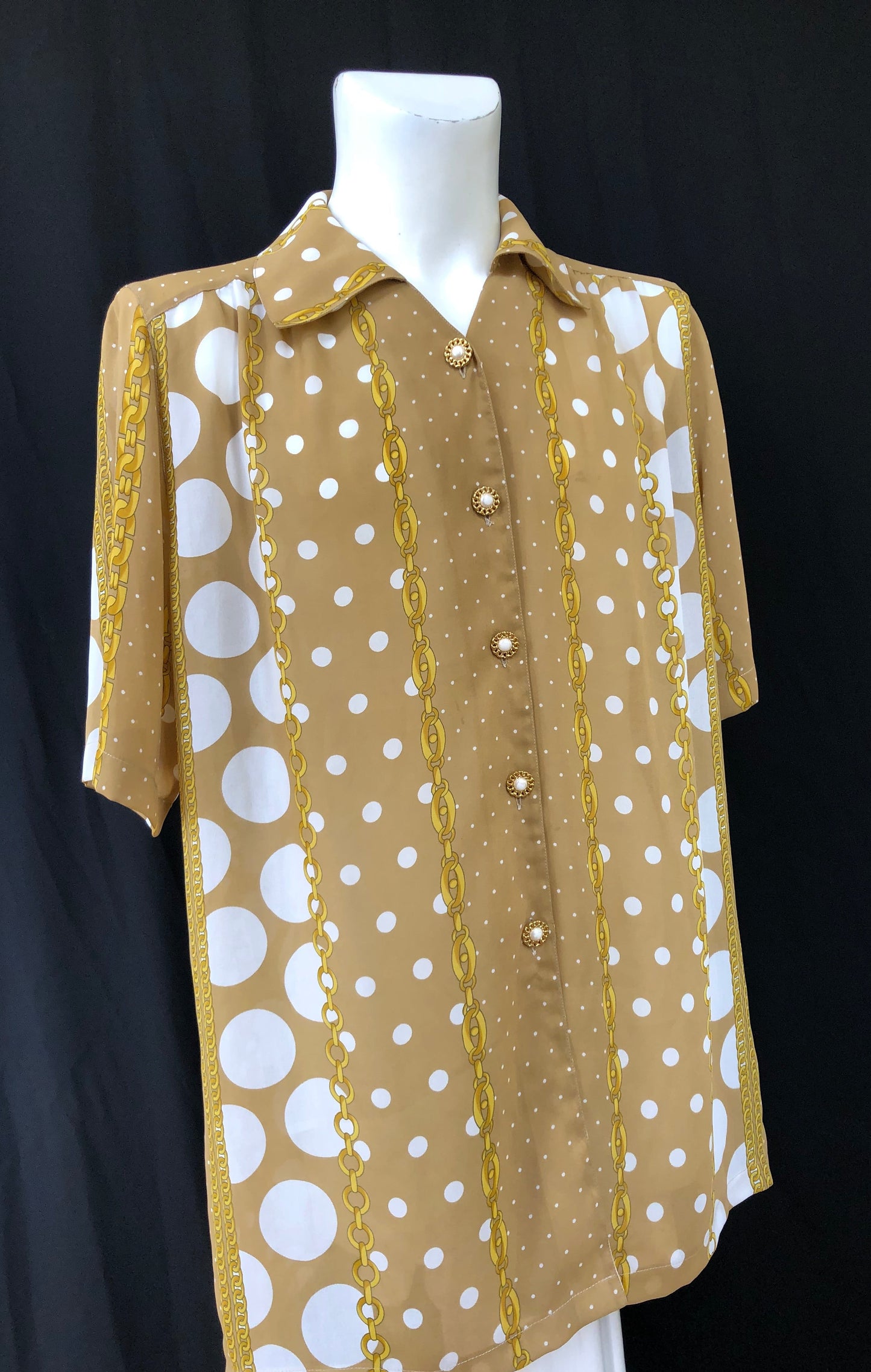 Tissu polyester marron à pois blanc et motifs chaînes jaune doré