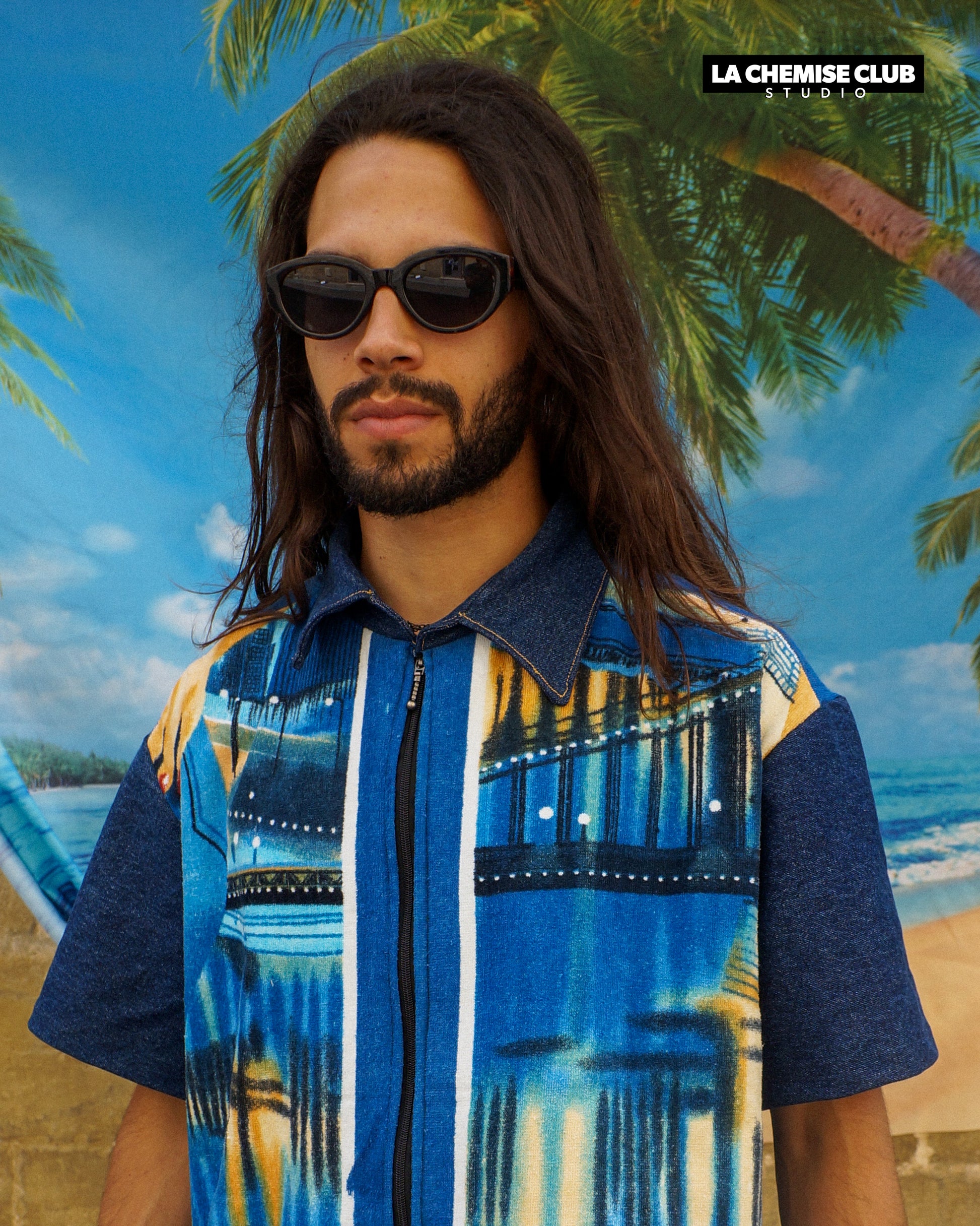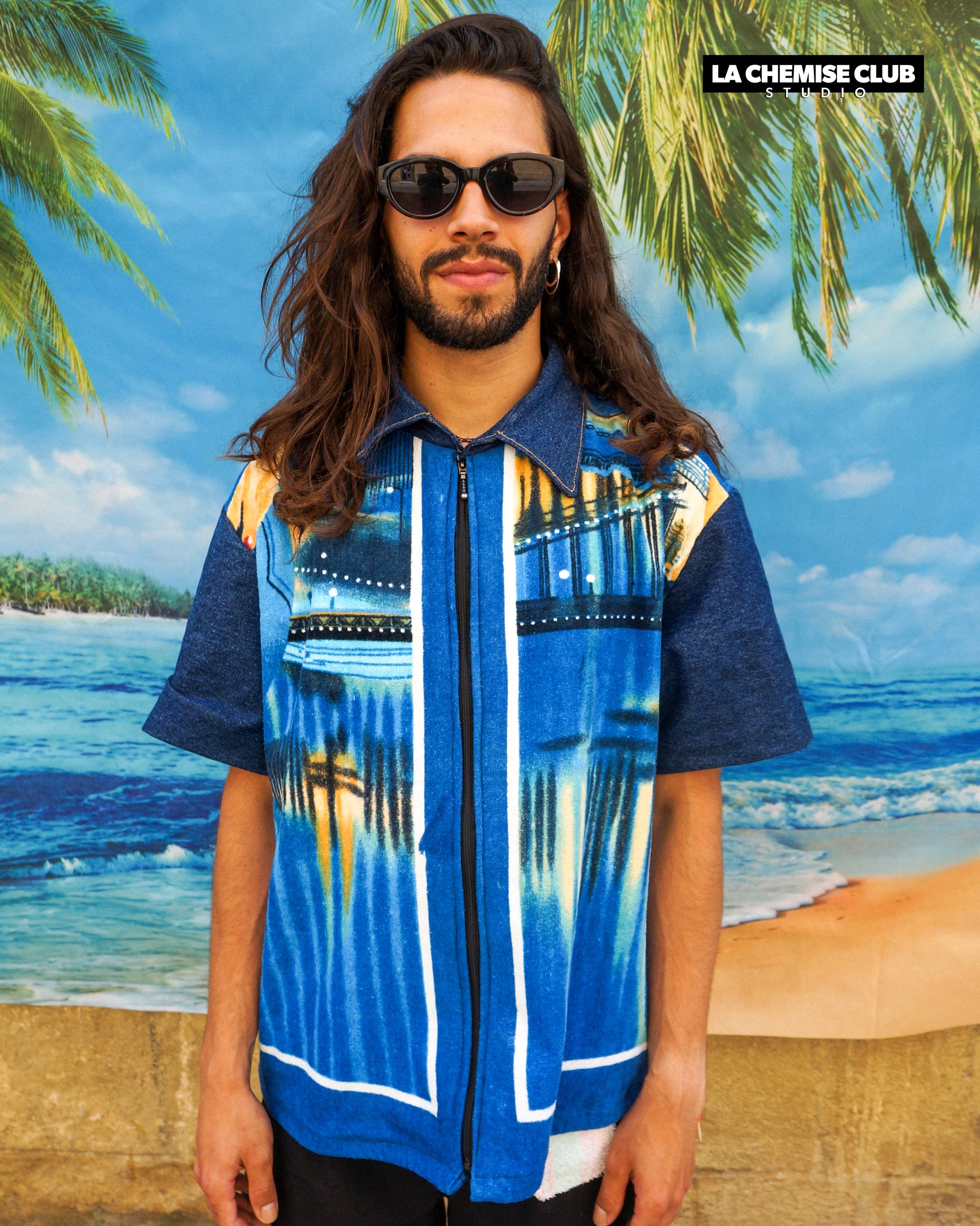 Manches et col en jean brut / avant et dos en serviette vintage imprimée d'un décor plage de nuit avec femme nue